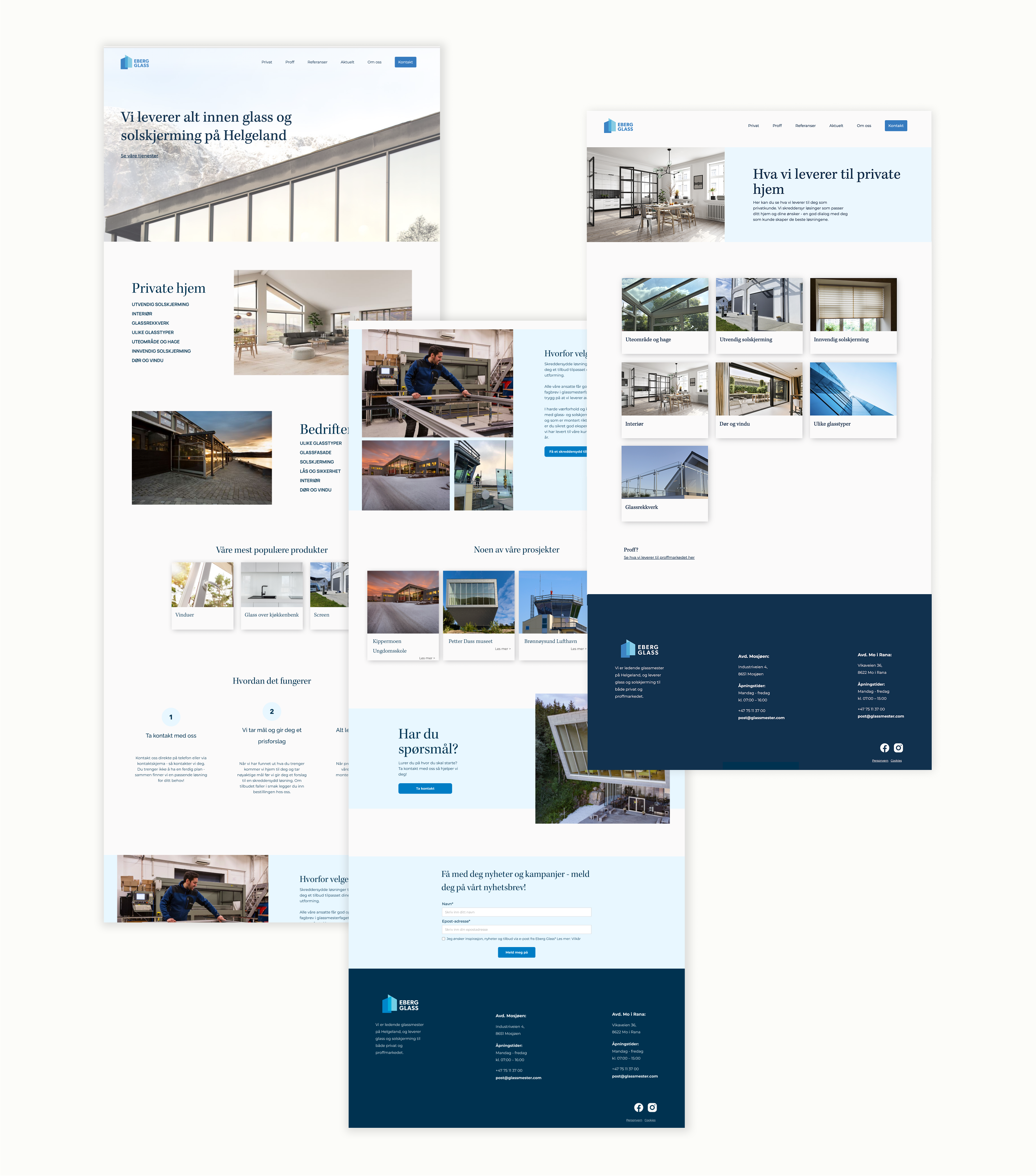 This project consisted of designing and delivering a complete visual brand identity for Eberg Glass. They are a glass manufacturer based in Mosjøen, Norway. The project consisted of creating their logo, visual identity, and a fully functional website that reflects both their craftsmanship and quality of work. Beyond the initial launch, our partnership has grown into ongoing support, including marketing materials, social media campaigns, and newsletters. This ensures that Eberg Glass not only has a strong visual foundation, but also a consistent and effective digital presence that continues to strengthen their brand and attract new clients